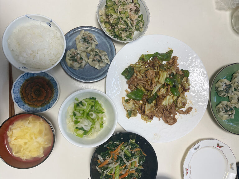 副菜:ニラ饅頭、かぶのレモンマリネ、小松菜ともやしのナムル、切り干し大根とツナ塩昆布の無限サラダ
